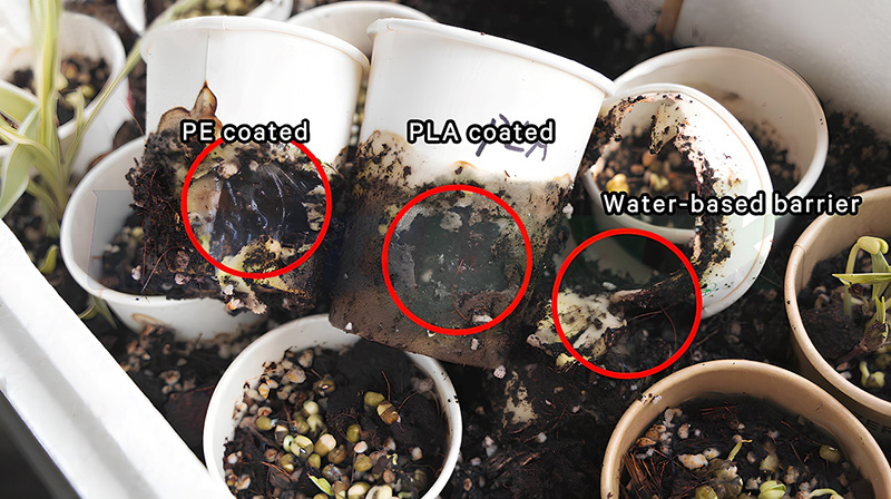 Через 245 дней водяная бумажная чашка полностью опубликована, волокна PLA были ухудшены, фильм о PLA разрядил, а пленка PE был в основном нетронутым.
